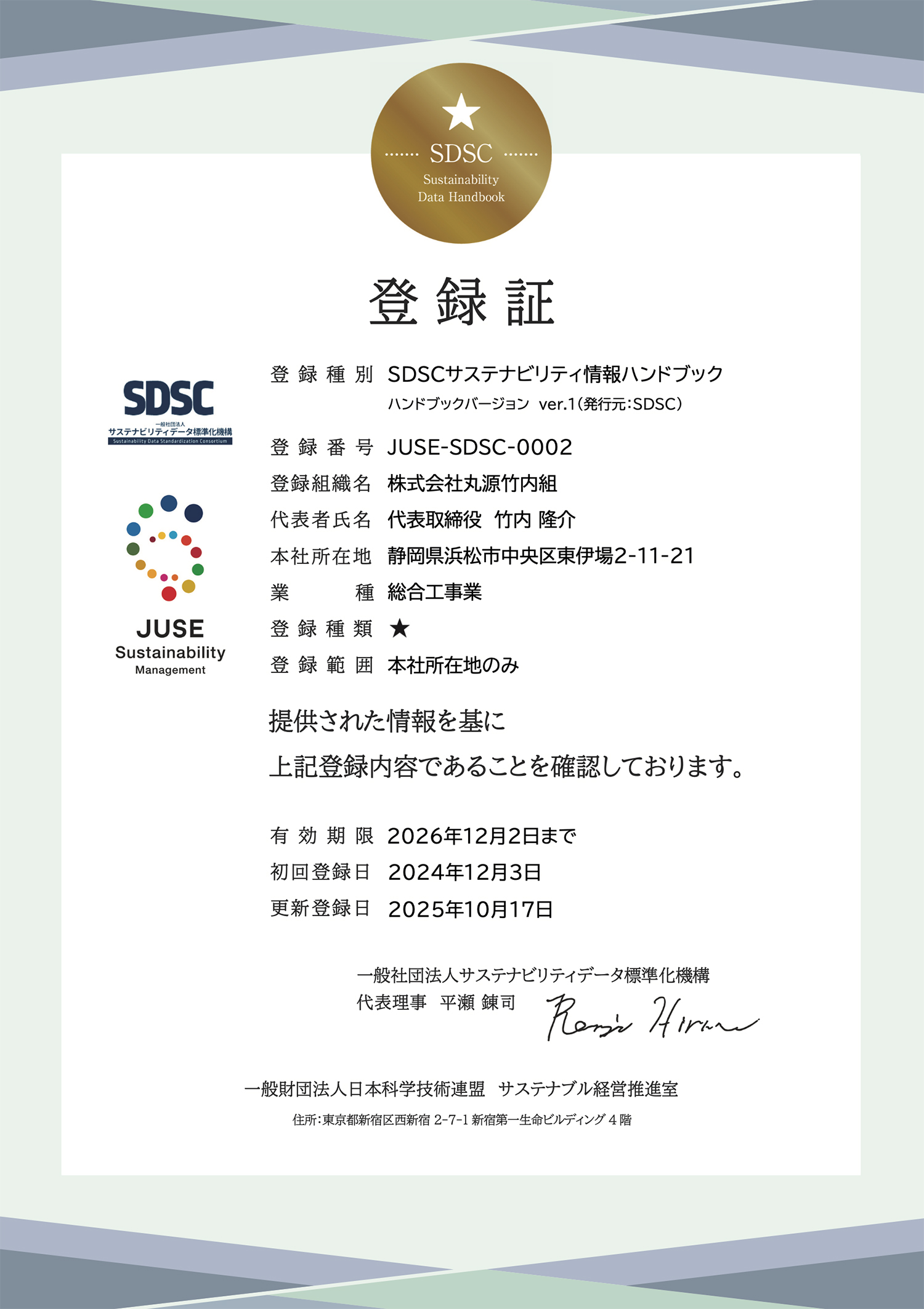 このたび、株式会社 丸源竹内組は一般社団法人サステナビリティデータ標準化機構(SDSC)が提供する第三者登録・検証制度を利用しました。